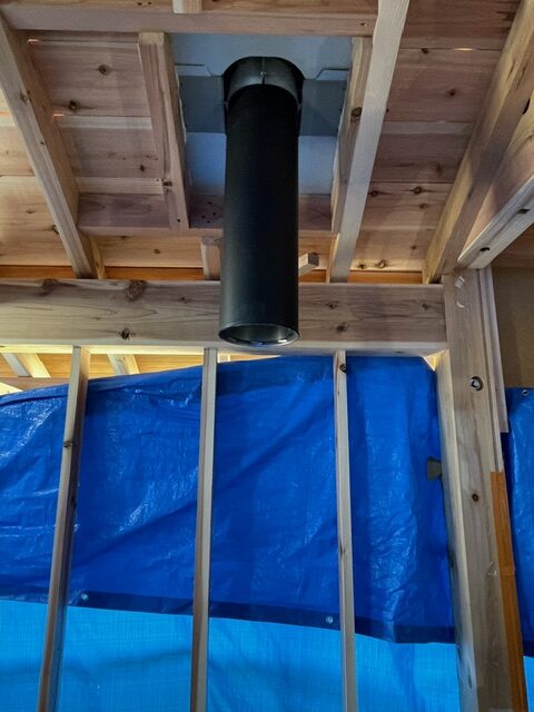 室内に降りてきた煙突、内装工事が終わり次第薪ストーブを設置します。