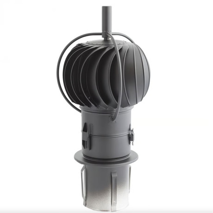 強風時に燃焼が悪くならないよう、風を味方に、最も効率的に利用して、風があるほどドラフト力が増す回転式チムニートップ。
